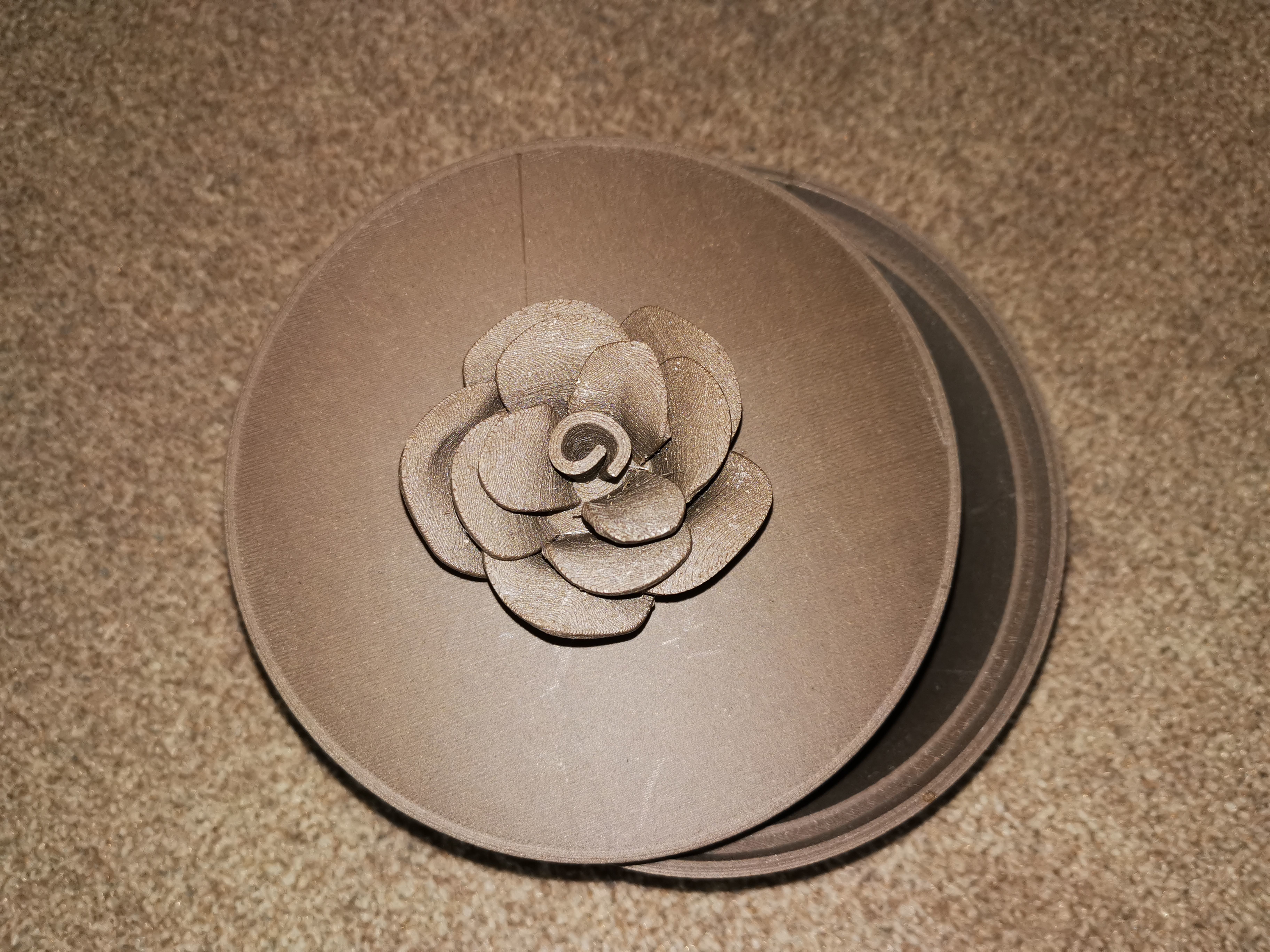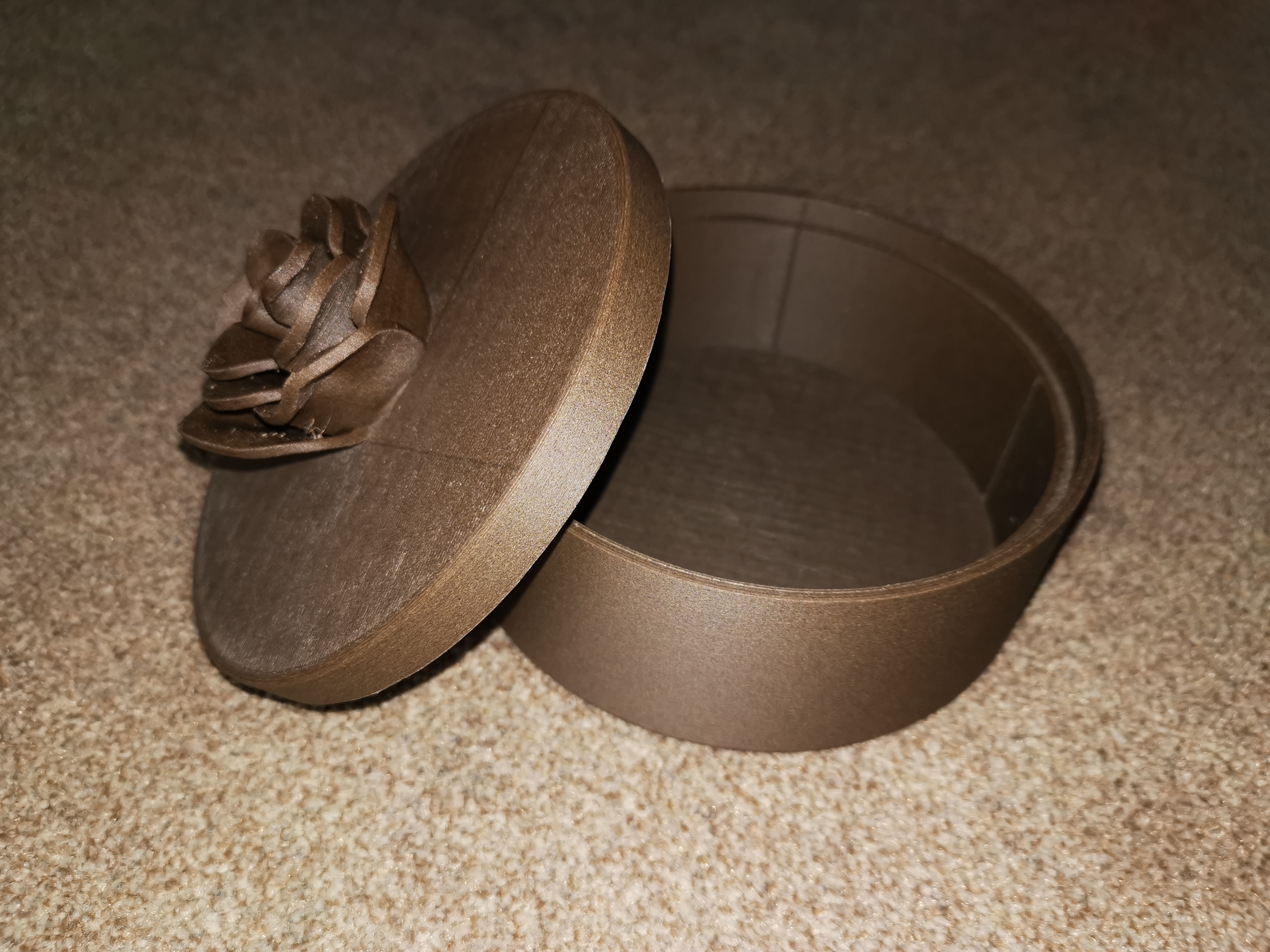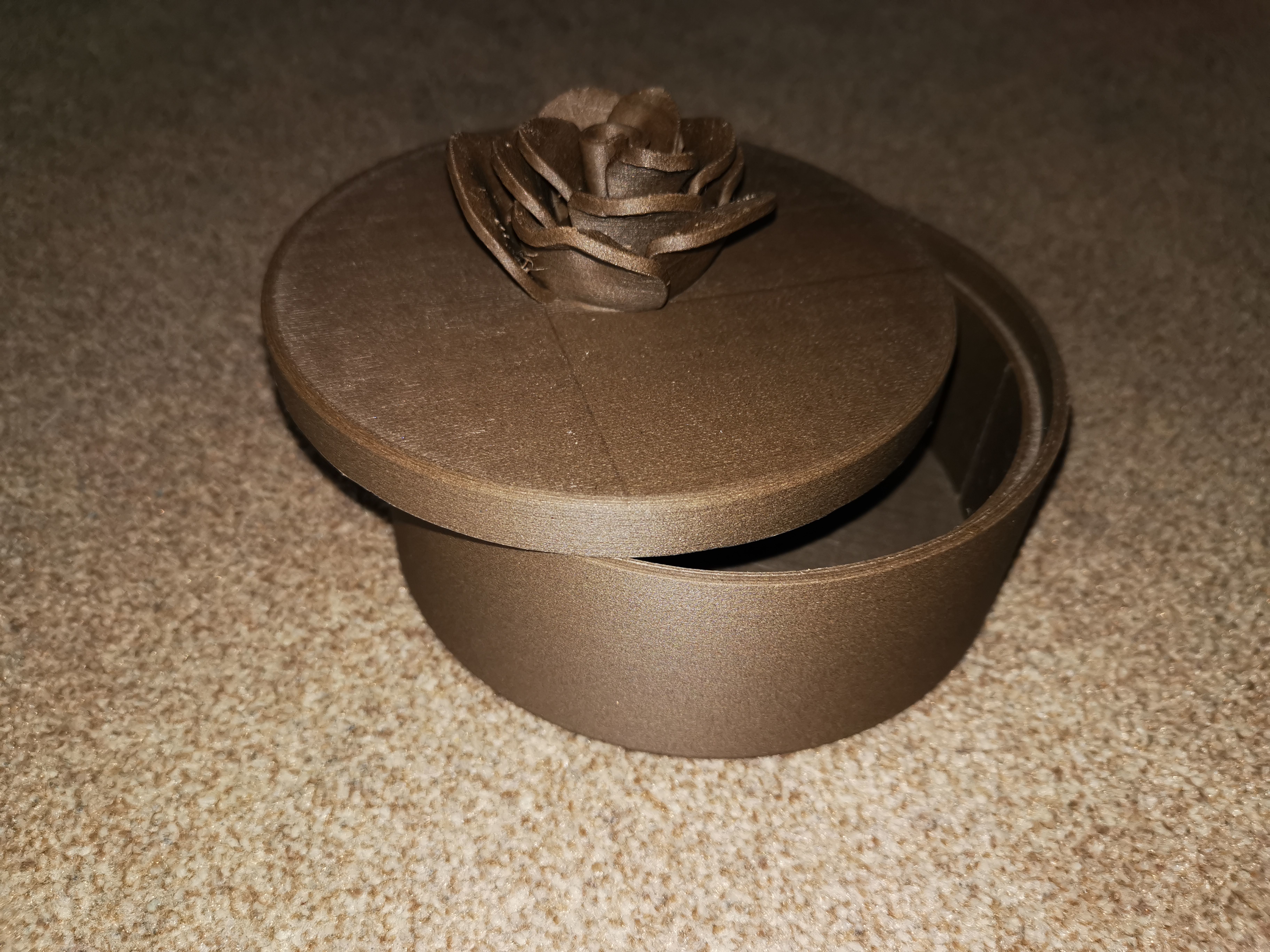 Красивая шкатулка для драгоценностей. Это напечатано из деревянного наполнителя. Можно печатать из любого материала. Также в комплект входит крышка с цветком.